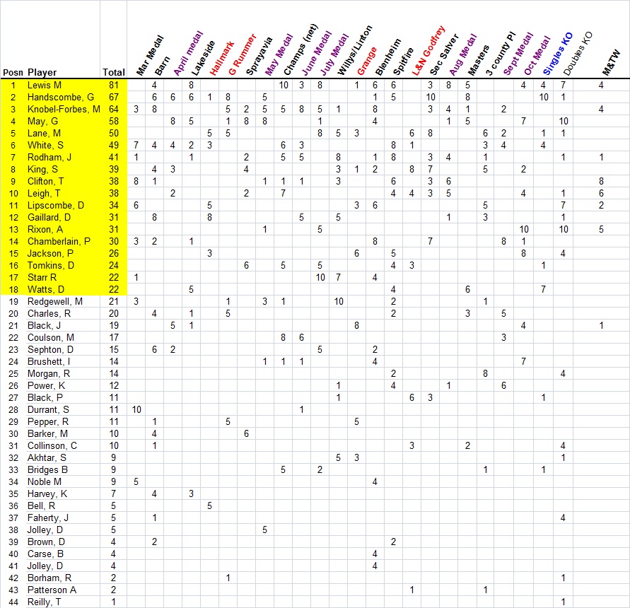 Final standings - yellow indicates those qualifying for First Class Shoot-Out